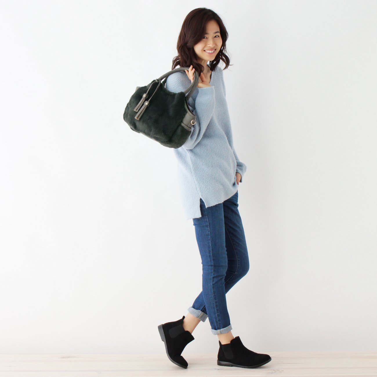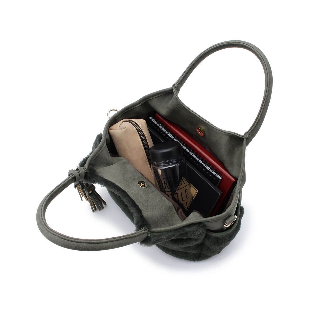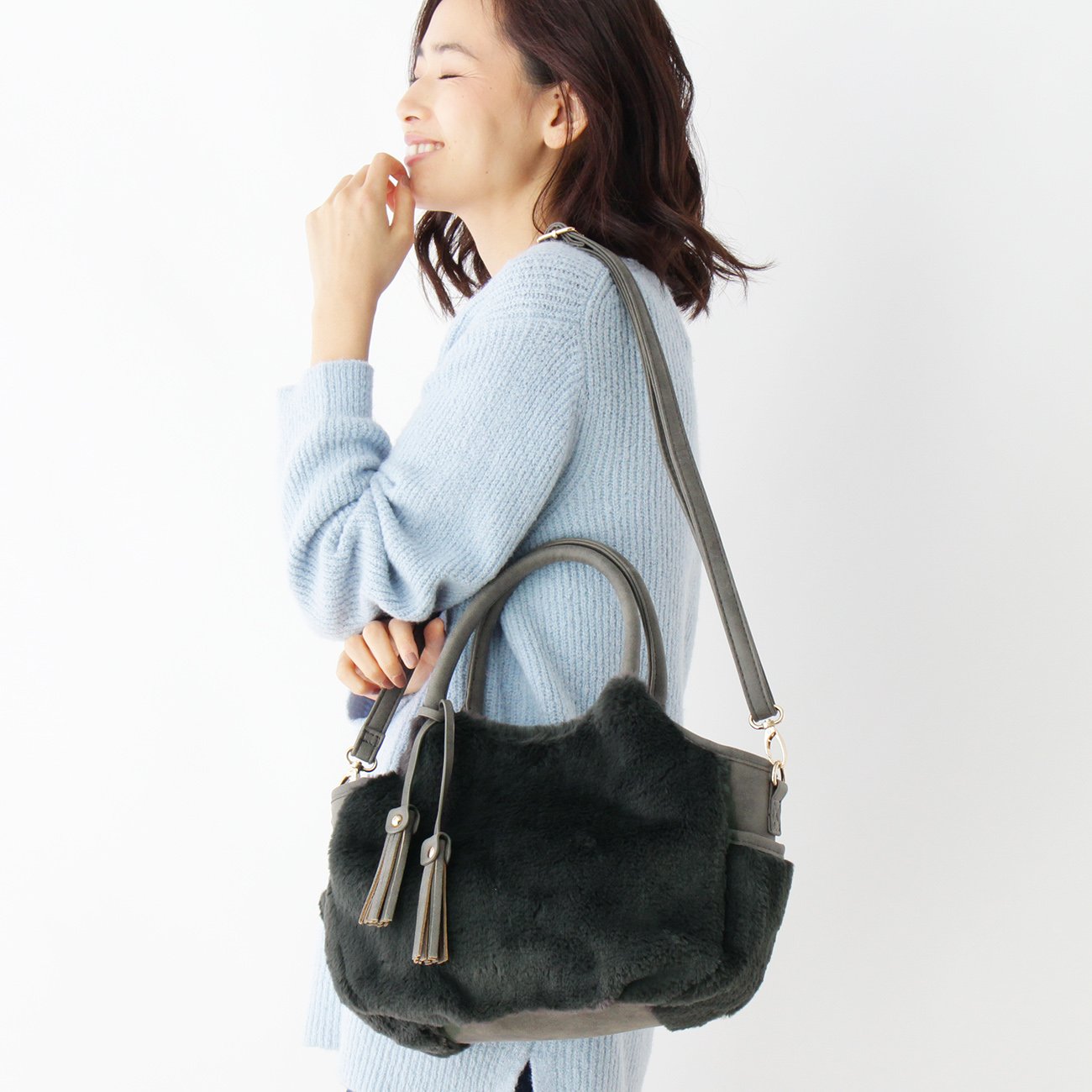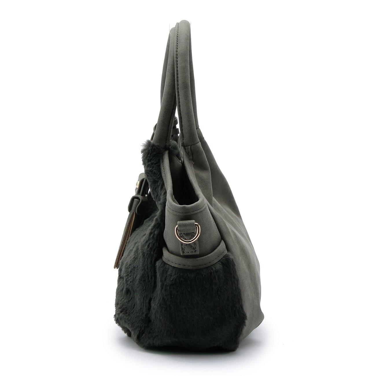 Double faced tote bag combining fake fur on one side and leather-like fabric on the other side.