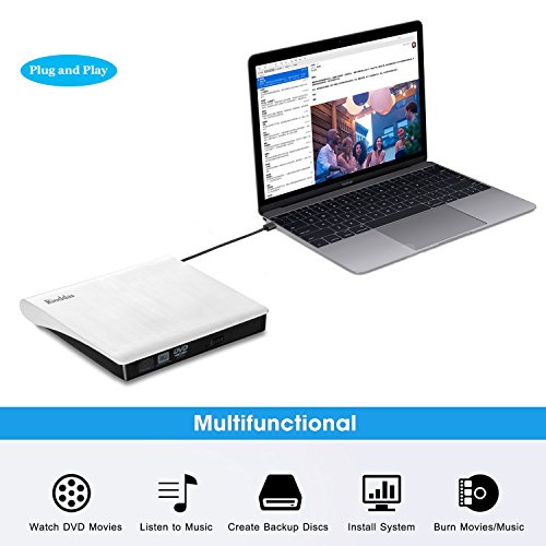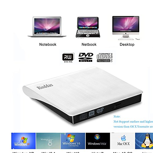 - [WIDE SUPPORT] Rioddas external CD Drive supports to read CD,VCD,SVCD,CD-R/RW,DVD-R/RW and burn CD+/-RW,DVD+/-RW, etc. Advanced chip, DVD-/+RW burner supports playing music, movies or copying/burning movies and music to DVD or CD.ideal for various devices,Windows XP/2003/Vista/7/8.1/10, Linux, all version Mac OS system Laptop, Notebook, PC, Desktop Computer.
