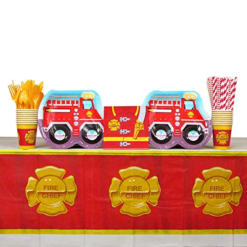 -. Feature : Firefighter Party Supplies Pack Includes: Dinner Plates, Luncheon Napkins, Cups, Table Cover, and Cutlery / Matching Cutlery including 16 Spoons, 16 Forks, and 16 Knives by Creative Converting / 16 Fire Truck Dinner Plates, 9" by Creative Converting / 16 Luncheon Napkins, 7" by Creative Converting / 1 Table Cover, 54"x108" and 16 Hot/Cold Cups, 9 oz. by Creative Converting