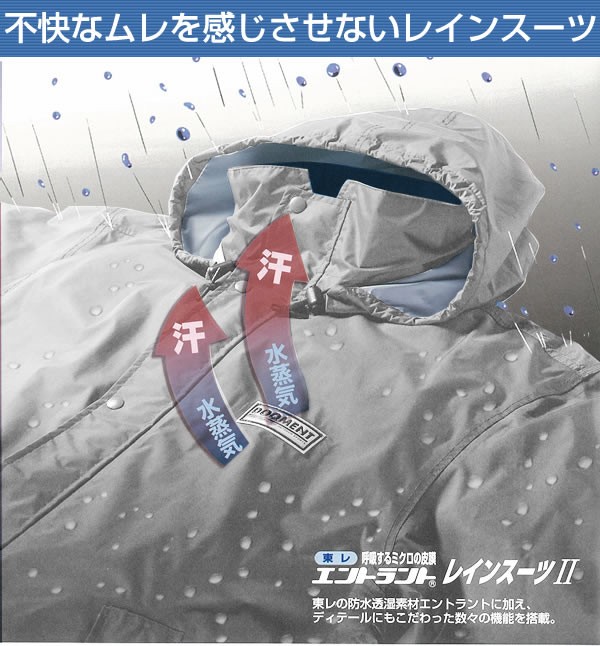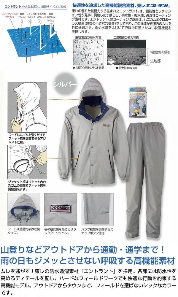 東レの呼吸するミクロ皮膜「エントラント」は防水透湿性に優れた素材。レインスーツの不快なムレを感じさせない高機能モデル!細部にまでこだわり、アウトドアでも通勤でも役立ちます。
