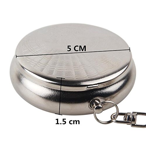 -. Feature : Product Dimensions (Diameter*H) -2.0*0.6 inches. / Package included: 1 keychain stainles steel ashtray. / Material: stainles steel. Easy to clean and maintain. Great for daily use,gifts,bars,KTV,restaurants,cafes,outdoor entertaining or traveling. / Light weight,sturdy & Solid Design. Mini portable design easy to carry, suitable for outdoor or indoor. / The Delivery usually cost 6-12 working days, not as Amazon shows: 14-28 working days.