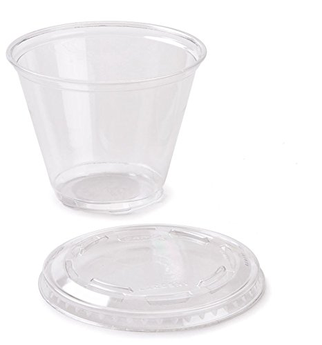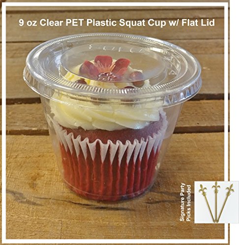 50 Count Plastic CLEAR 9 oz Squat Cup and Non-vented Flat Lid, Parfait Cup w/ Signature Party Picks