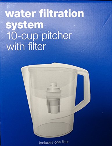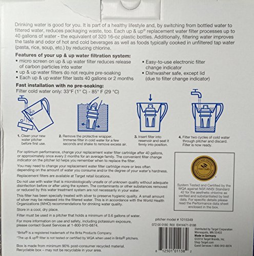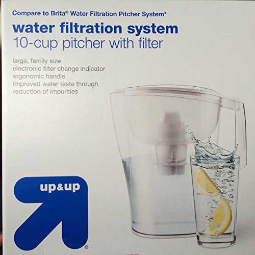 -. Binding : Kitchen -. Brand : Unknown -. Color : Clear -. EAN : 0812501011382 -. Feature : Large 10-cup Pitcher with one filter / Electronic filter change indicator / Improved water taste through reduction of impurities / Each filter lasts 40 gallons (ewuivalent of 320 16-oz plastic bottles) or 2 months / Made in Germany -. IsAutographed : 0 -. Label : Up & Up -. Manufacturer : Up & Up -. Model : 1015349 -. PackageQuantity : 1 -. ProductGroup : Home -. ProductTypeName : HOME -. Publisher : Up & Up -. Size : Large -. Studio : Up & Up -. Title : Up & Up - 10- Cup Water Pitcher Filtration System with Filter -. UPC : 812501011382