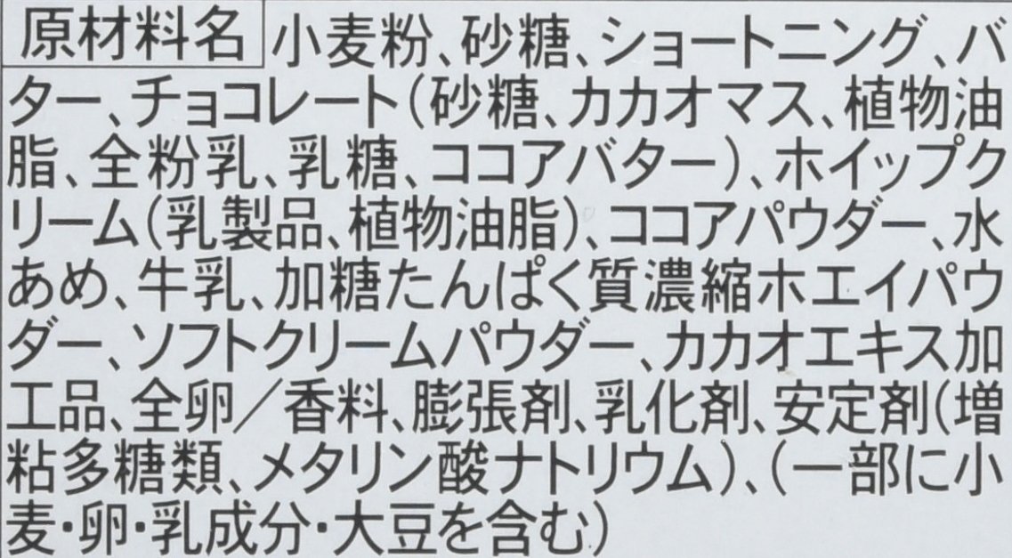 - 原材料:小麦粉、砂糖、ショートニング、バター、チョコレート(砂糖、カカオマス、植物油脂、全粉乳、乳糖、ココアバター)、ホイップクリーム(乳製品、植物油脂)、ココアパウダー、水あめ、牛乳、加糖たんぱく質濃縮ホエイパウダー、ソフトクリームパウダー、カカオエキス加工品、全卵 / 香料、膨張剤、乳化剤、安定剤(増粘多糖類、メタリン酸ナトリウム)、(一部に小麦・卵・乳成分・大豆を含む)