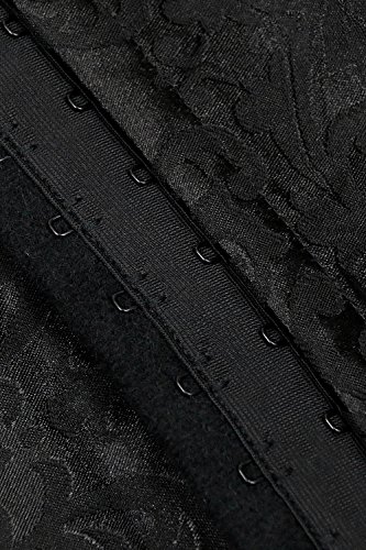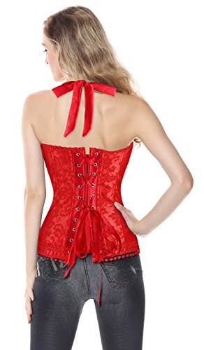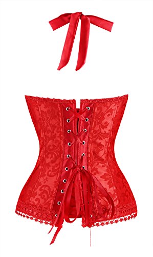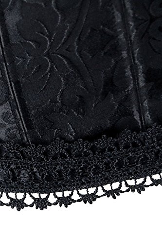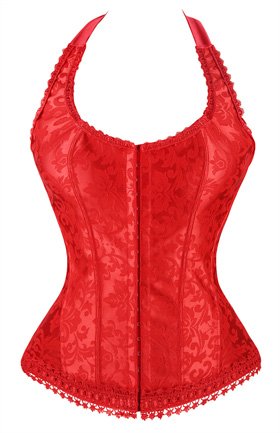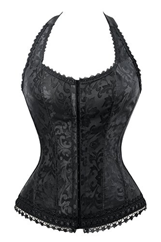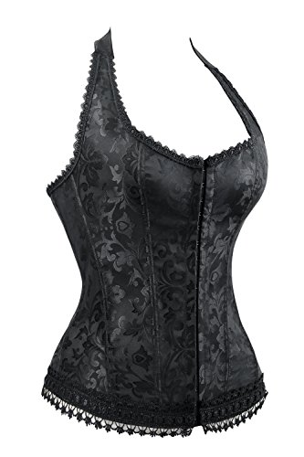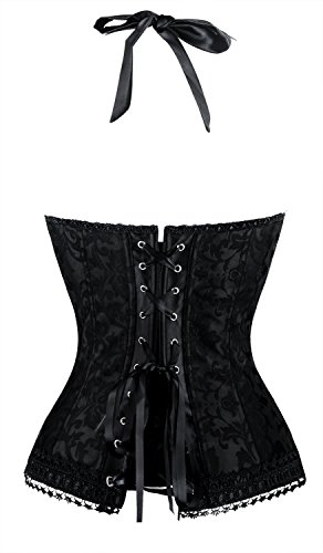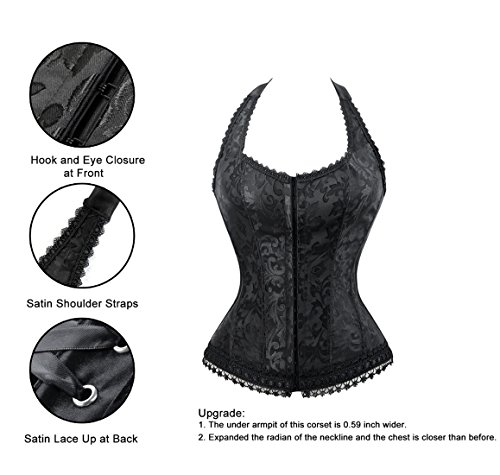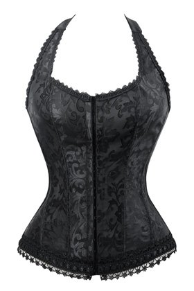 Binding : Apparel Product Description Fashion elegant black halter satin jacquard weave corset, hook and eye closure in front, with prefect floral embroidery edge decorate can improve your glamours, ribbon lacing in back for cinching. Matching g-string.
