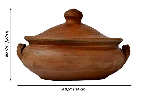 Dimensions: length (including handles) - 10.2 inches, diameter - 9.5 inches, height (with lid) - 6.5 inches. Clay pots can be used in the oven and in the microwave oven.