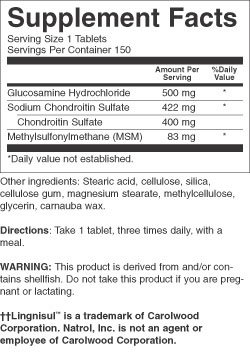 Natrol Glucosamine Chondroitin and MSM is a Triple formula to support joint flexibility and comfort. In an Easy-swallow smaller tablet, Natrol has combined three of the best joint health ingredients to give your joints a rest. First, Glucosamine has been shown to repair and regenerate cartilage tissue. Second, Chondroitin helps promote lubricating fluids for your joints and cartilage. Third, MSM helps maintain elasticity of joint tissues. 1, 2, 3 useful ingredients for promoting flexibility, mobility, and of course, comfort. No yeast, wheat, corn, milk, egg, soy, glutens, artificial colors or flavors, added sugar, starch or preservatives. Natrol makes this product in the U.S.A.Feature