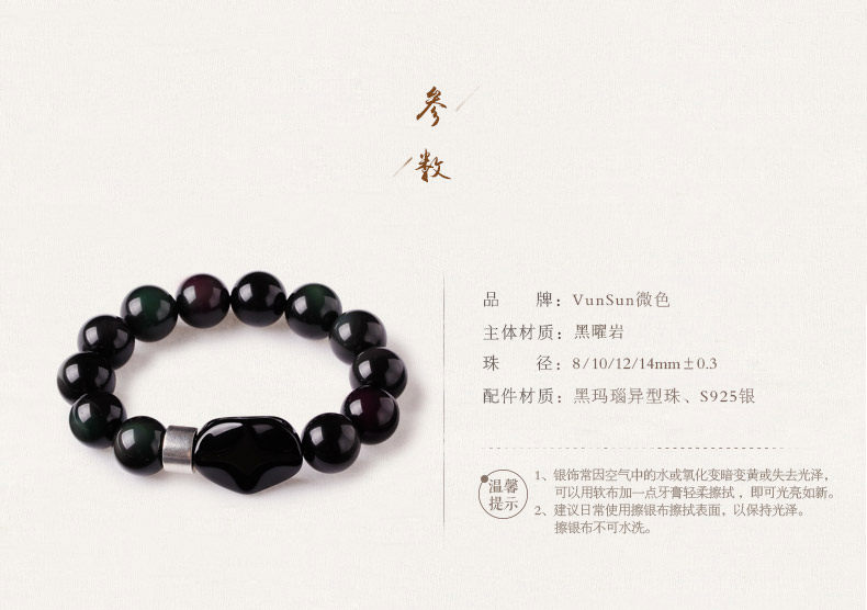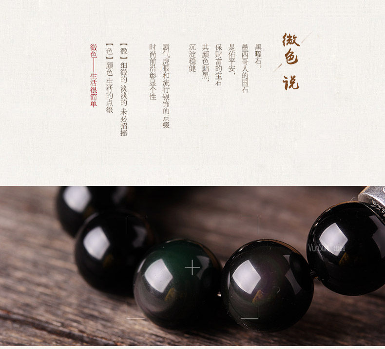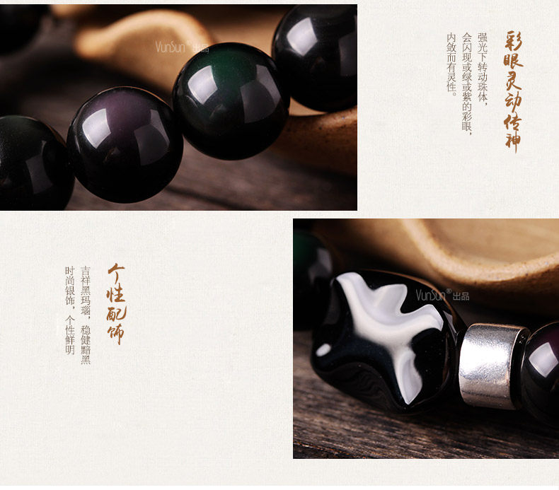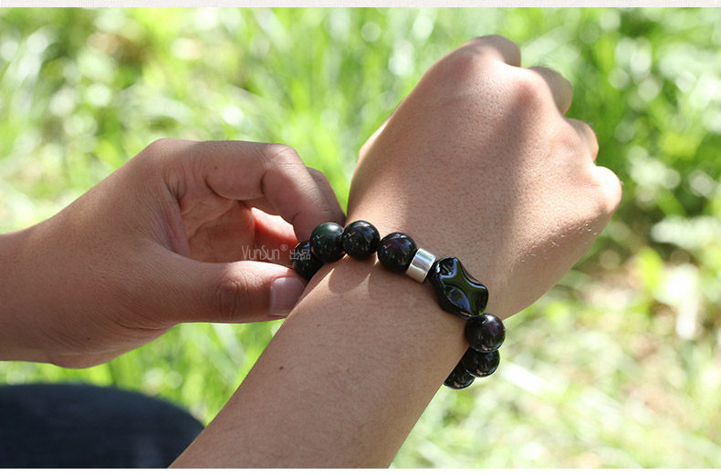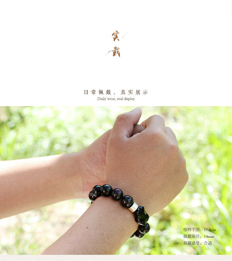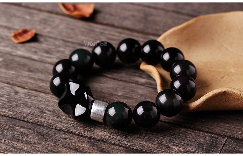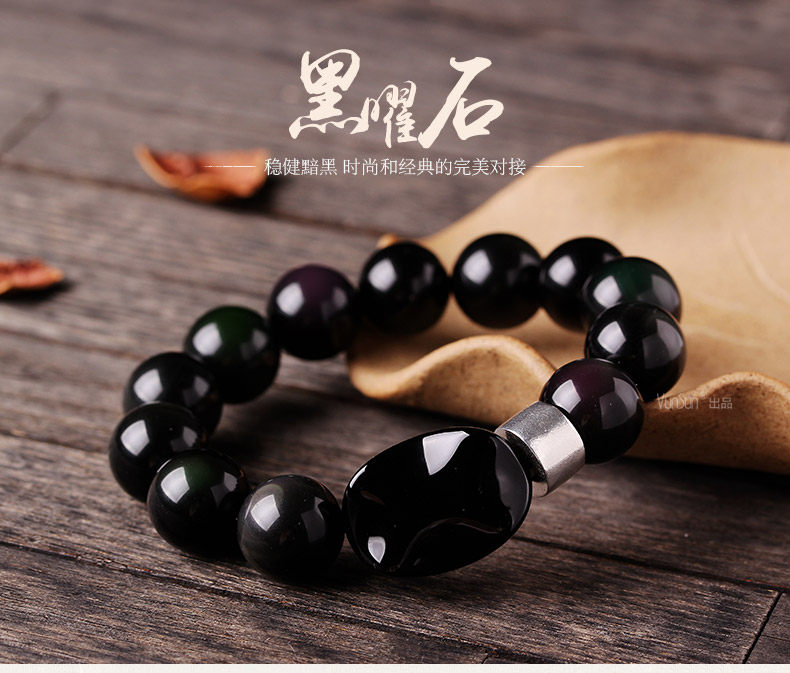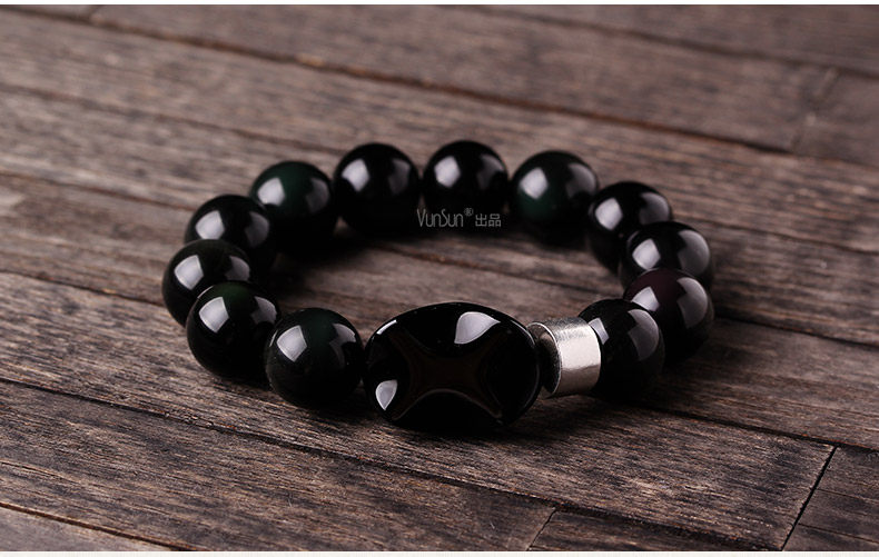 天然彩虹眼黑曜石手链男款单圈黑色水晶银手串佛珠简约饰品
