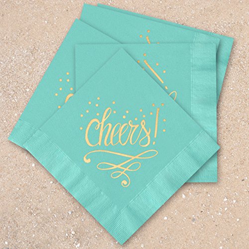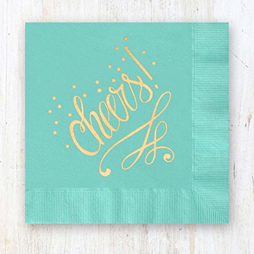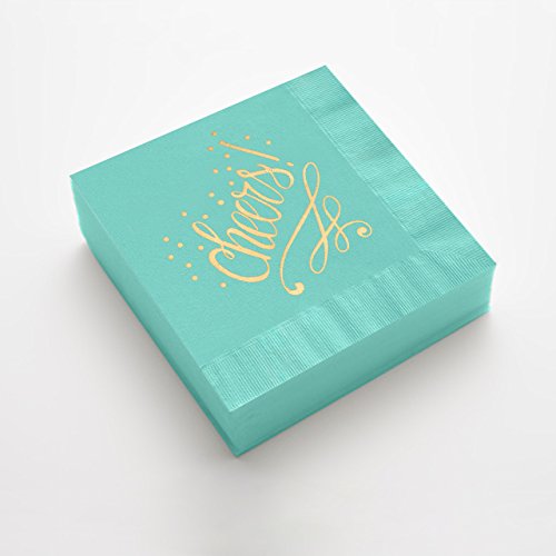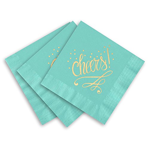 -. Title : Cheers to You! Beverage Cocktail Napkins - Set of 25 aqua paper napkins with gold foil