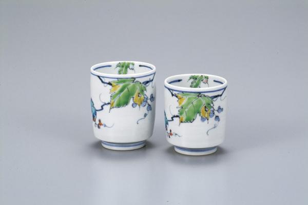 ブドウの葉がメインに、つるや実がアクセントとなって、爽やかな色合いがステキな湯呑セットになっています。