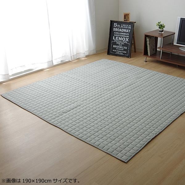 キルティングラグカーペットです。キルティング加工をすることで、中わたが寄ったりズレたりしにくくなります。中材には固わたを使用しており、適度なクッション性があります。フローリングを傷つけにくいよう、裏には不織布を貼っています。 |