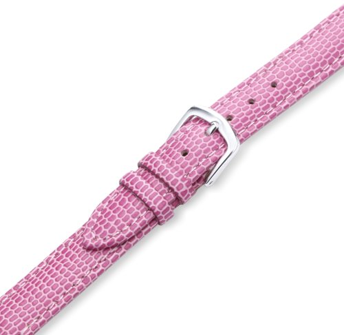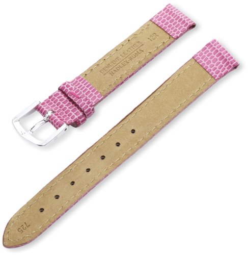 Studio : Hadley-Roma Publisher : Hadley-Roma Binding : Watch Product Description This is one of our Hottest selling styled bands. The construction is Remborde with a 3mm medium padding and matching colored stitching. The Top materials are Genuine Leather embossed with a Java Lizard Pebble Grain to resemble a natural skin. The Lining is a Genuine Nubuck Suede Leather that is Water-Resistant. The Buckle is a Hypo-Allergenic Aluminum Buckle in White Color . The width is 12mm at the Lug end where it attaches to the watch and tapers to a 10mm Buckle end. The length is 105x65mm which is the Regular length for ladies and has seven holes on the long section to adjust for proper fitting . The Color is Pink. 0