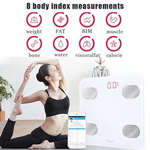 Studio : Ouyii Publisher : Ouyii Binding : Health and Beauty Product Description Specification Size: 10.2 10.2 1 inch/260*260*27mm Capacity: 11-396lb/5-180kg Batteries: 3*1.5V AAA Division:0.2lb/0.1kg Unit:lb/kg(Switch the unit by setting>my information>Unit) Frequently Asked Question Answer Why doesn't the scale work?Why doesn't the display show data? Why does the date on the screen disappear in a flash? -Please check whether the insulation piece is taken out, batteries are installed or batteries are in low and need replacing. Display indicates "Err"when measuring body fat: -Your feet or scale are too wet. -Overload the maximum capacity(396lb/180kg) -Body parameter settings should be with Height(3'3-7'3/100-220cm),Aged(10-99 years old). The scale can not connect with App -The App is required to be opened when weighing. -Make Sure to turn on the bluetooth function on your device. -Please re-turn on the bluetooth and restart New iwellness on your device. No body fat data measured when weighing. -Body fat scale requires weighing with dry and bare feet. -Ensure the Bluetooth function is open. -Please input you personal information with Height(3'3-7'3/100-220cm),Aged(10-99 years old). What's Included Your Bluetooth Scale box includes: Smart Bluetooth scale Batteries: 3*1.5V AAA User Manual Guarantee The scale has been checked for accuracy prior to leaving the factory and has a guarantee against any defect in either workmanship or materials for a period of 1 year. 0