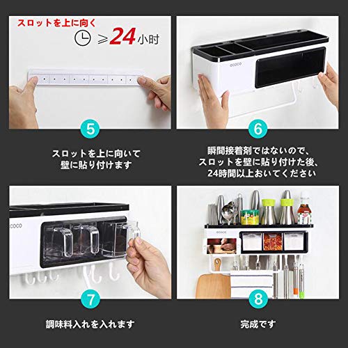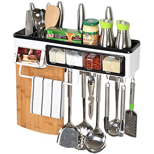 多機能壁掛け式キッチンラック、一つに7つの機能を付きます:4つ分け透明な調味料置き、二つの箸さし、大容量物置き、移動式フック付き、ロングなタオル掛け、包丁置き、隠れ携帯スタンド、キッチンを綺麗に収納できます;