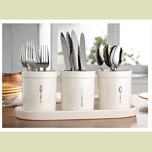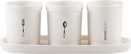 Studio : Home Essentials Beyond Publisher : Home Essentials Beyond Binding : Kitchen Product Description Organize your flatware and silverware with ease. This set is perfect for entertaining, kitchen decor, dining, barbecue, tailgate and more! 4 PC ceramic flatware caddy set includes: three 4" x 4.6" ceramic crocks and one 13.75" ceramic tray. Each crock cleverly designed with a picture of a fork, spoon and knife for a fresh updated decor look. 0