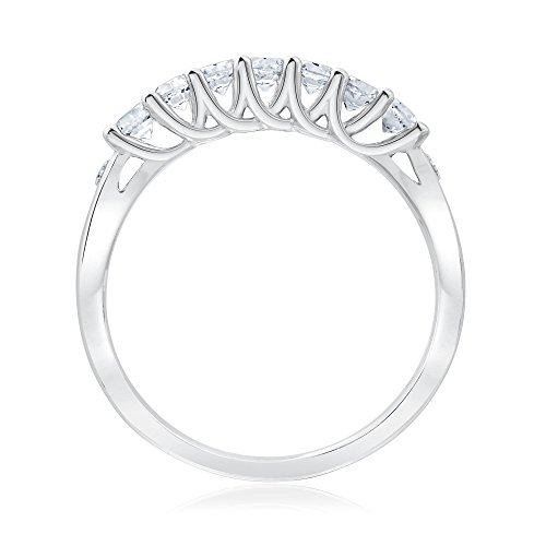 This sterling silver ring features 7 created white sapphires prong set side by side with an accent diamond on the ends. Ring is 2.5mm at the top and tapers down to 2mm at the back.