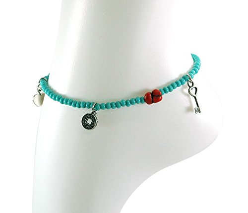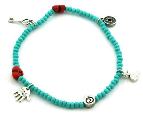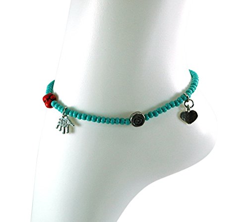 -. Binding : Jewelry -. Brand : MIZZE Made for Luck Jewelry -. Department : womens -. Feature : A beautiful handmade turquoise beads and red corals charm anklet / All charms are silver plated / Anklet measures 9.5 inches / Stretch anklet, one size fits most ankles. -. Label : MIZZE Made for Luck Jewelry -. Manufacturer : MIZZE Made for Luck Jewelry -. Model : MZ6010TQS -. MPN : MZ6010TQS -. PartNumber : MZ6010TQS -. ProductGroup : Jewelry -. ProductTypeName : FASHIONNECKLACEBRACELETANKLET -. Publisher : MIZZE Made for Luck Jewelry -. Studio : MIZZE Made for Luck Jewelry -. Title : Turquoise Colored Stretch Bead Handmade Anklet with Red Corals & Hamsa Hand, Heart and Feng Shui Coin