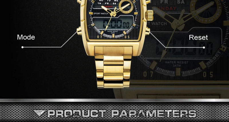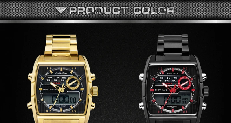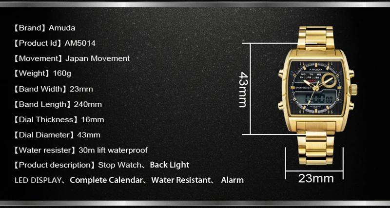 Feature:Water Resistant,LED display,Multiple Time Zone,Back Light,Complete Calendar,Week Display,Alarm