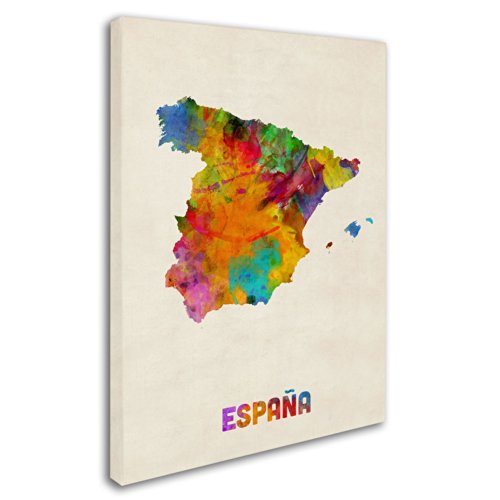 This ready to hang, gallery-wrapped art piece features a colorful watercolor map of Spain. Art and design were always Michael's favorite subjects at school. He was fortunate to land a job as a graphic designer at one of London's most prestigious publishing companies after leaving University. After 12 highly enjoyable years Michael Tompsett made the decision to pursue a full-time career creating his own work. The freedom and time to be able to focus solely on his own projects has been a wonderful experience. Although Michael likes to experiment with different styles and subjects, his main focus is on map art. He enjoys looking for unique and interesting ways to depict something which is very familiar. Maps are visual representations of the world we live in, a world which is incredibly diverse. Apart from maps, Michael Tompsett creates urban landmark and cityscape designs. Giclee (jee-clay) is an advanced printmaking process for creating high quality fine art reproductions. The attainable excellence that Giclee printmaking affords makes the reproduction virtually indistinguishable from the original piece. The result is wide acceptance of Giclee by galleries, museums and private collectors. Gallery wrap is a method of stretching an artist's canvas so that the canvas wraps around the sides and is secured a hidden, wooden frame. This method of stretching and preparing a canvas allows for a frameless presentation of the finished painting.Feature