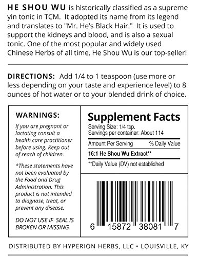 Ingredients: Prepared He Shou Wu Extract* Other Ingredients: None Suggested Serving Size: ½ teaspoon which is about 2 grams 1-2 x a day, or as directed by a health professional Suggestions on usage: This powder can be added directly to smoothies, juices, and protein shakes. The flavor is actually one of the better ones, and would blend well with anything sweet, fruity, or savory. Vanilla undertones give it a versatile and fun base to work with. It is already prepared and ready to consume as is- no heat or stewing necessary. Powdered extracts generally mix more easily in warmer temperatures, but a blender can be used to help incorporate the powder into cooler foods and beverages or simply to ensure a more thorough distribution. *CONCENTRATED EXTRACT: The active constituents are extracted from the herb and then concentrated to a 16 to 1 ratio. GRAY HAIR: The defining factor that He Shou Wu possesses is its ability to maintain natural hair color and even reverse gray hair! This is one of the most popular uses of He Shou Wu, as one study in China showed 89% of the participants to have a portion of their gray hair return to natural color, and of that, 65% were fully recovered. It is important to keep in mind that this study was administered under daily consumption of the herb for several months. According to Dr. Subhuti Dharmananda, director of the Traditional Medicine Institute of Portland: "Healthy hair depends on the sufficiency of blood stored in the liver. When the liver blood is deficient, it is unable to rise and nourish the head; the hair then turns gray or falls out. The health of the kidneys is expressed in the hair of the head, and graying or loss of hair is a sign of kidney deficiency. The teeth depend on the sufficiency of bone matter, which is governed by the kidneys."Feature