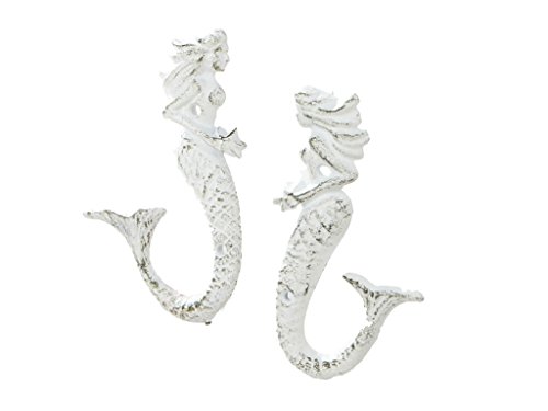 Mermaid Cast Iron Wall Hooks - Set of 2 - Whitewash Antique Finish - Hangers for Coats, Aprons, Hats, Towels, Pot Holders, More