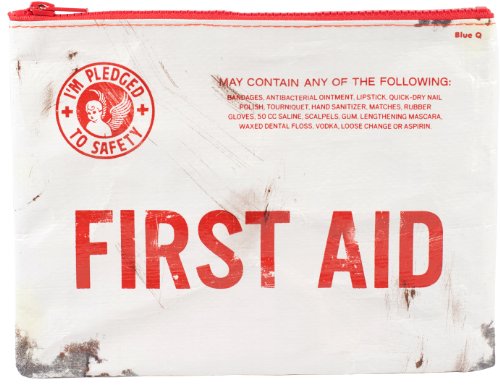 Studio : Blue Q - Home Publisher : Blue Q - Home Binding : Misc. Product Description Whether you stow bandages and antibacterial ointment or lipstick and quick-dry nail polish in your First Aid Kit Zipper Pouch you will Be Prepared. An awesomely convenient size. Keeps your tiny things tidy and fits inside your other Blue Q bags. 95 % post-consumer recycled material has a crushed, wrinkled look when sewn into Pencil Cases. It's all normal for the high recycled content. Feels so good to be good. Features a chunky, color-coordinated zipper. 4.25" x 8.5". 0