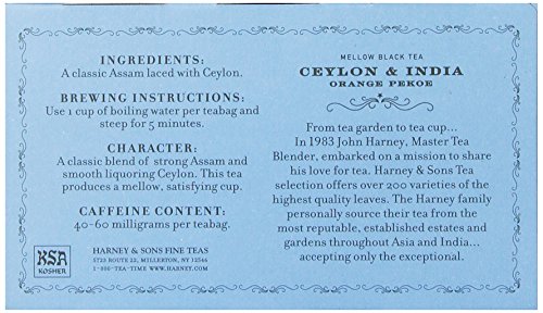 -. Binding : Grocery -. Brand : Harney & Sons -. EAN : 0636046101274 -. Feature : Classic blend of strong Assam and smooth liquoring Ceylon produces a mellow, satisfying cup / Traditional staple in many households, drink this tea whenever you need a comforting cup / Full flavors of this tea can be enjoyed plain or tempered with milk and sugar / Full-bodied tea with a muted honey and citrus aroma / Certified Kosher and steep for 4-5 minutes in boiling water before drinking -. IsAutographed : 0 -. IsMemorabilia : 0 -. Label : Harney & Sons -. Manufacturer : Harney & Sons -. Model : 16127 -. MPN : 16127 -. NumberOfItems : 1 -. PackageQuantity : 1 -. PartNumber : 16127 -. ProductGroup : Grocery -. ProductTypeName : GROCERY -. PublicationDate : 2013-03-27 -. Publisher : Harney & Sons -. Studio : Harney & Sons -. Title : Harney & Sons Orange Pekoe Tea, 50 Tea Bags -. UPC : 636046101274
