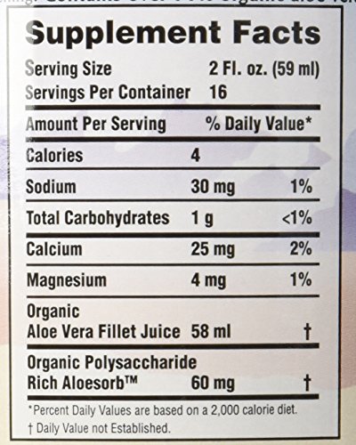 Suggested Use As a dietary supplement Upon opening, refrigerate immediately. Take 2 ounces (4 Tbsp) per serving, alone or mixed with a favorite juice. Up to 8 ounces daily. For those with more severe digestive issues, we would recommend you take the aloe 15-30 minutes before each meal. Recommended to consume within 5-6 months after opening. Made with 99.5% certified-organically grown aloe vera Aloe content purity certified by IASC Certified Kosher No water added - Or as directed by your healthcare professional. Supplement FactsServing Size: 2 fl oz (59 ml)Amount Per Serving% Daily Value***Calories4Sodium30 mg1%Total Carbohydrates1 gCalcium35 mg4%Magnesium4 mg1%Filtered organic Whole Leaf Aloe Vera Juice58 ml*Organic Polysaccharide Rich Aloesorb60 mg* *Daily Value Not Established ***Percent Daily Values are based on a 2,000 calorie diet