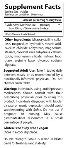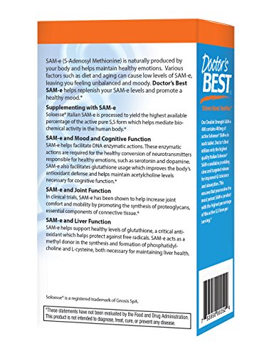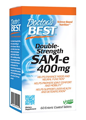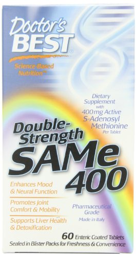 SAMe 400 contains 400 mg of active SAMe in each tablet. Doctor's Best utilizes only the highest quality Italian SAMe available on the market. This ensures that you receive the most potent SAMe product with the highest percentage of the active S,S form per serving, bar none. S-Adenosyl Methionine (SAMe) is derived from the amino acid methionine and is one of the most important methyl donors in the central nervous system. Methylation (donation of methyl groups) is an essential process in ensuring the proper function of a number of organ systems. SAMe is involved in numerous biochemical reactions in tissue including the liver, joints and brain. SAMe is also required for the biosynthesis of critical neurotransmitters and hormones. The manufacturing process of SAMe yields two forms, the S,S and the R,S isomers. The S,S isomer is the active form that mediates biochemical activity in the human body, whereas the R,S form is considered to be biologically inactive. The Italian SAMe used in Double-Strength SAMe 400 is processed to yield the highest available percentage of the active pure S,S form on the market. SAMe may enhance cartilage protection and promote the synthesis of proteoglycans, essential components of connective tissue. Clinical studies show an ability of SAMe to enhance mobility and movement, and promote joint comfort.* SAMe-catalyzed methylation reactions promote the synthesis of neurotransmitters, which have the potential to promote enhanced mood. SAMe may also upregulate the production of phosphatidylcholine, supporting cognitive function.* SAMe enhances liver synthesis of glutathione, an antioxidant. Glutathione promotes detoxification and liver protection. Studies show SAMe may protect liver tissue from injury caused by a number of toxins.*Feature