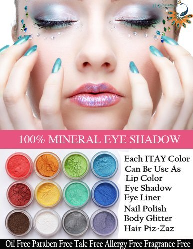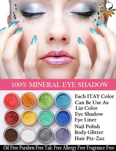 Studio : ITAY Publisher : ITAY Binding : Misc. Product Description ITAY Mineral Eye Shimmer: Elegant, attractive 100% all-natural mineral eye colors shimmer shades cling to eyelids and will not crease or fade all day or night with our water resistant formula. Colors can be applied dry or wet to activate a more intense effect that will enhance the natural beauty of your eye color. They can also be used as fabulous eyeliners to perfectly match your eye shadow blends! ITAY Mineral Beauty Eye Primer: ITAY Eye primer is a wonderful and waterproof way to go from a shimmering to softer matte look. It intensifies and lengthens the life of your ITAY mineral eye shadows, smooths out your natural skin tones for a beautiful skin texture, and still completely avoids any smudging, creasing, or fading. This eye foundation will last all day, even for seriously active lifestyles! 6 uses in one ITAY Mineral Shimmer: 1.Accentuate the Eye: ITAY Shimmer allows you to choose from a large variety of color options to create striking and unique eye styles. It can also be used in a wet or dry method to achieve either a light sheer look, or a high-sheen glam look that will last all day/night. 2.Accentuate the Lips: Apply a small amount of ITAY Shimmer to the lips using itay clear lip balm or lip gloss for a beautiful and creative lip accent. 3.Enhance Nail Color: Mix ITAY Shimmer with ITAY clear nail polish to get that beautiful nail color you've been looking for, as well as a perfect match with your eye makeup to tie your look together. 4.Add a Touch of Color to Hair: Combine ITAY Shimmer with your favorite hair gel and apply to one or more strands of hair for a unique glow that requires no bleaching or dying. 5.Accentuate Your Skins Natural Glow: Mixed with lotion, your favorite ITAY Shimmer can provide you with a subtle and luxurious shimmer that accentuating your natural glow. 6.Enhance Eyeliner: ITAY Shimmer can be applied around the lash line to enhance and embellish your eyes. Just wet the tip of an ITAY eyeliner brush and apply. MADE IN USA