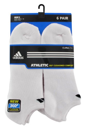 - Feature : They are cushioned for comfort with a welt cuff for added durability. Order Multiple: Four 6-packs / These adidas 6-Packs feature ClimaLite construction to wick moisture and keep your feet dry. / Polyester, Spandex / Knit-in 3-bars on top of foot / shoe size 6-12 Imported