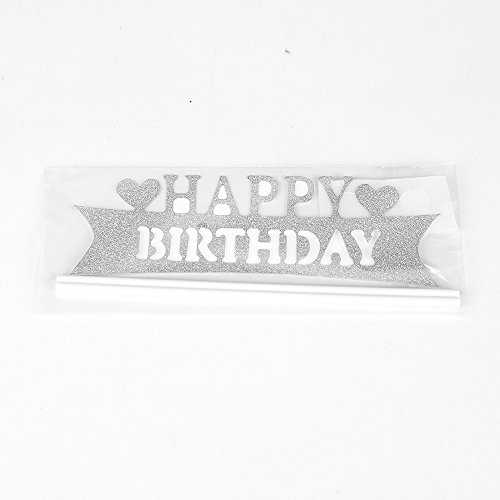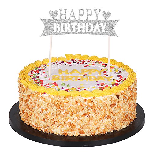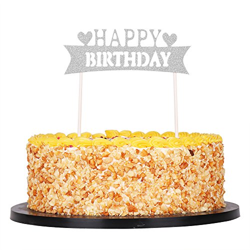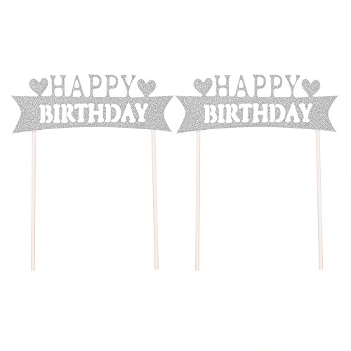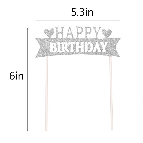 QIYNAO Silver Glitter Happy Birthday Cake Topper Party Decorations Set of 2