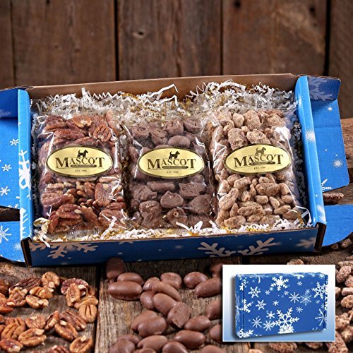 -. Binding : Misc. -. Brand : Mascot Pecan Shelling Company -. EAN : 0764920230694 -. Feature : We have done all the work to make gift giving easy this year! / A Combination of 3 Favorites is sure to please / No Wrapping needed. Our Snow Flake Gift Box makes giving a breeze! / Mascot Candy and Pecan Company makes candy in small batches so our customers get fresh product everytime! -. Label : Mascot Pecan and Shelling Company -. Manufacturer : Mascot Pecan and Shelling Company -. PackageQuantity : 1 -. ProductGroup : Grocery -. ProductTypeName : GROCERY -. Publisher : Mascot Pecan and Shelling Company -. Studio : Mascot Pecan and Shelling Company -. Title : Mascot Nut and Candy Gifts since 1955 - TRIPLE TREAT Gift Box Cinnamon Glazed, Chocolate Covered, Roasted & Salted Pecans -. UPC : 764920230694
