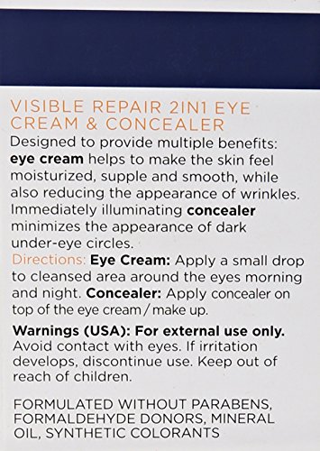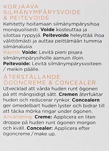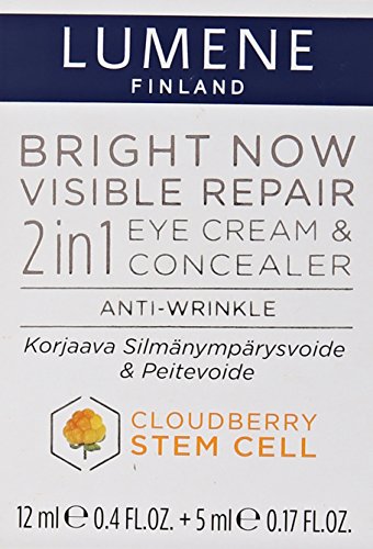 -. Binding : Health and Beauty -. Brand : Lumene -. EAN : 6412600802931 -. Feature : The eye cream moisturizes and reduces wrinkles and delays the formation of new ones / It also protects against the harmful effects of free radicals / The concealer provides instant brightening and helps to cover dark under-eye circles / Unique cloudberry stem cell technology helps to smooth out the skin and reduce wrinkles by protecting and maintaining the skin's own stem cell activity and by boosting its natural hyaluronic acid production -. IsAdultProduct : 0 -. Label : Lumene Oy -. Manufacturer : Lumene Oy -. Model : 80293 -. MPN : 80293 -. NumberOfItems : 1 -. PackageQuantity : 1 -. PartNumber : 80293 -. ProductGroup : Beauty -. ProductTypeName : BEAUTY -. PublicationDate : 2015-02-20 -. Publisher : Lumene Oy -. ReleaseDate : 2015-03-12 -. Size : .21 OZ -. Studio : Lumene Oy -. Title : Lumene Bright Now Visible Repair 2 in 1 Eye Cream and Concealer, 0.57 Fluid Ounce