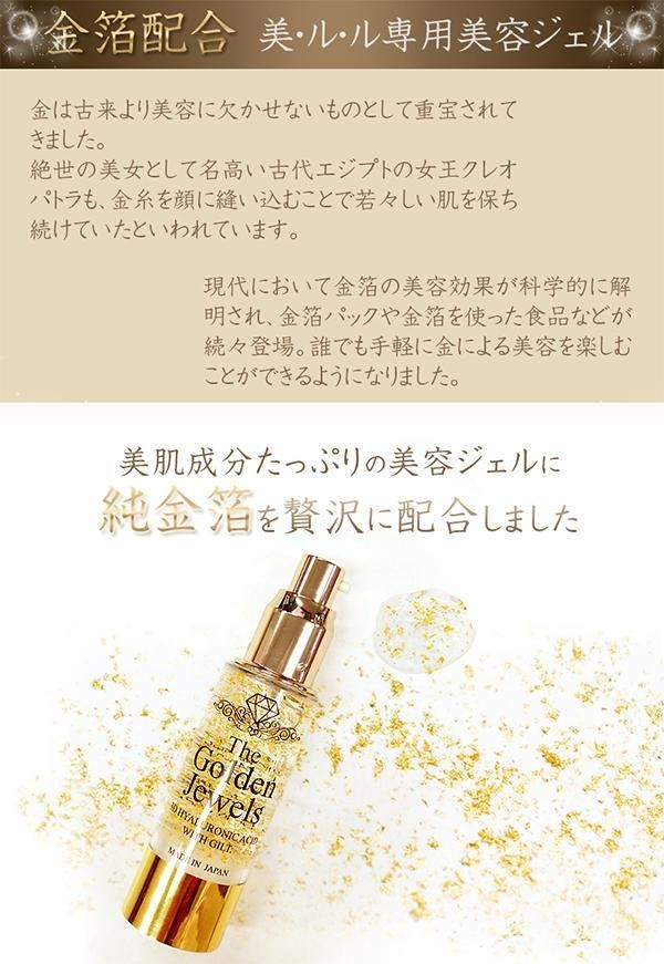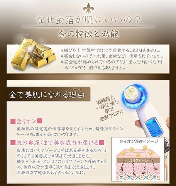 | クレオパトラが美しさを保つために最も愛した美容法と言われる「金」を贅沢に配合した美容ジェル♪通常の美容液としてもお使い頂けますが、美顔器と一緒に使う事でより保湿効果が高まり、うるツヤ肌に導きます。 |