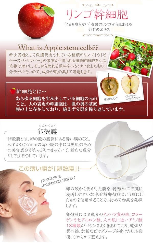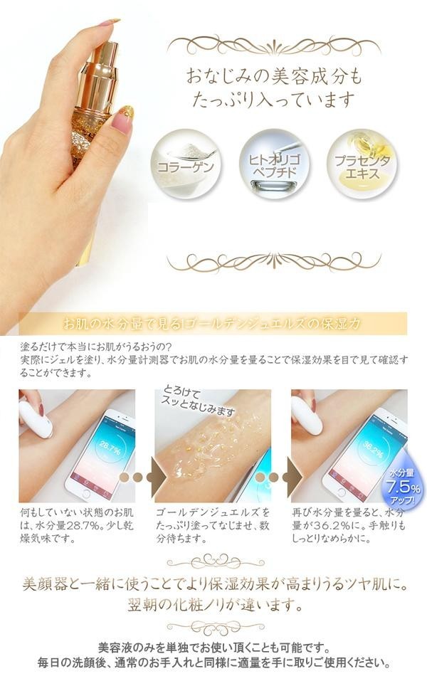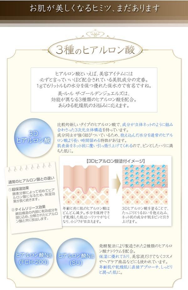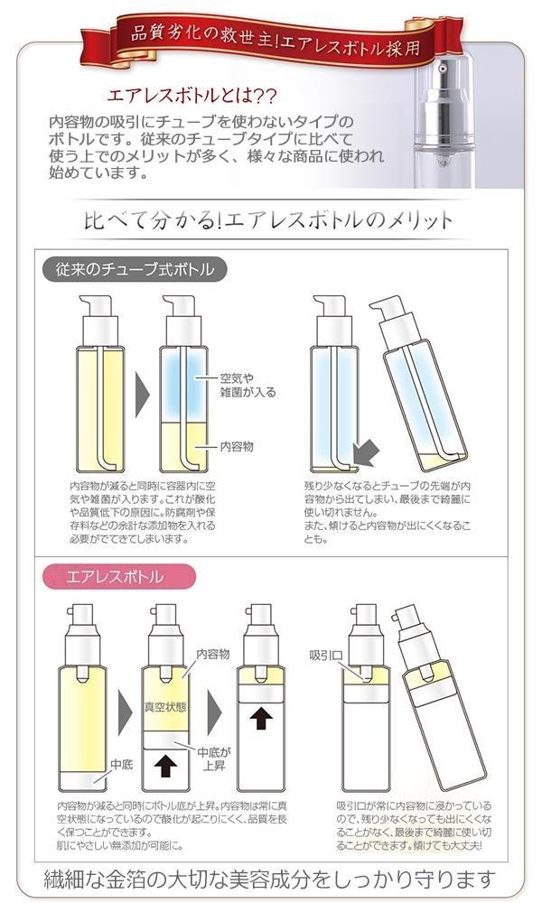 | 成分 | 水、BG、グリセリン、ペンチレングリコール、カルボマー、フェノキシエタノール、水酸化Na、ヒアルロン酸クロスポリマーNa、金、ヒアルロン酸Na、塩化Na、マンニトール、水溶性コラーゲン、ヒトオリゴペプチド-1、リンゴ果実培養細胞エキス、レシチン、1.2-ヘキサンジオール、加水分解卵殻膜、プラセンタエキス(ウマ)、キサンタンガム |