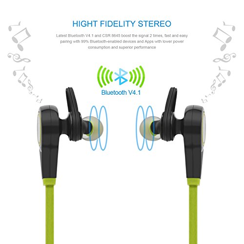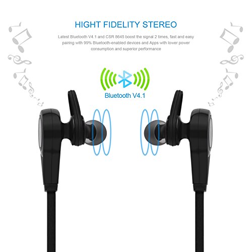 -. Feature : Latest Bluetooth V4.1 and CSR 8645 boost the signal 2 times, fast and easy pairing with 99% Bluetooth-enabled devices and Apps with lower power consumption and superior performance / Built in HD microphone with CVC6.0 noise cancellation and audio enhancement technology give Bluetooth earphones Hi-Fi stereo sound / Built-in ceramic antenna ensures stable and strong signal even when you are jogging or doing other exercise and gives you high fidelity and clear audio experience / The behind-the-neck wireless design and the control keys free you from the restrain of cables while doing exercise and enable you to easily control music and phone calls / Up to about 5-hour playtime after one full charge, build-in rechargeable Li-battery for quick easy charging. Power meter displayed on iPhone, iPod touch, iPod nano, iPad, iPad mini, MacBook or iMac