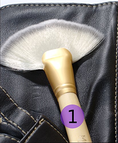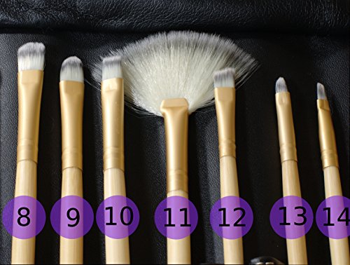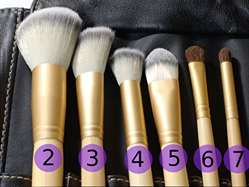 The brushes are made of high density synthetic Taklon bristles, bamboo handles, and double-crimped aluminum ferrules. The black leather-look carry/storage case is soft. It has attractive stitching, and is secured with a magnetic latch. The case is included.