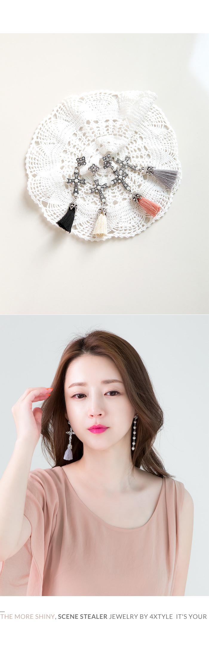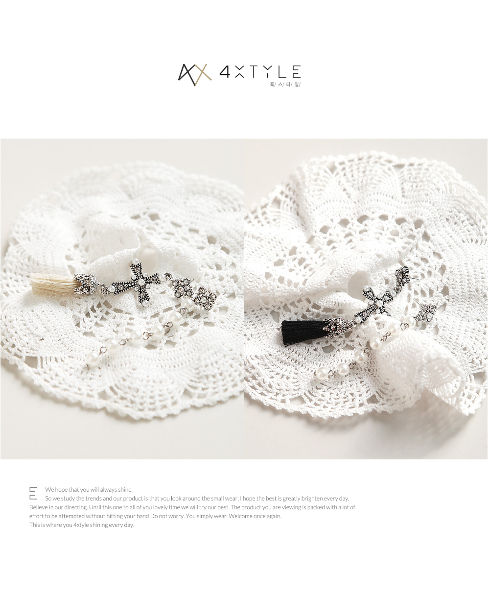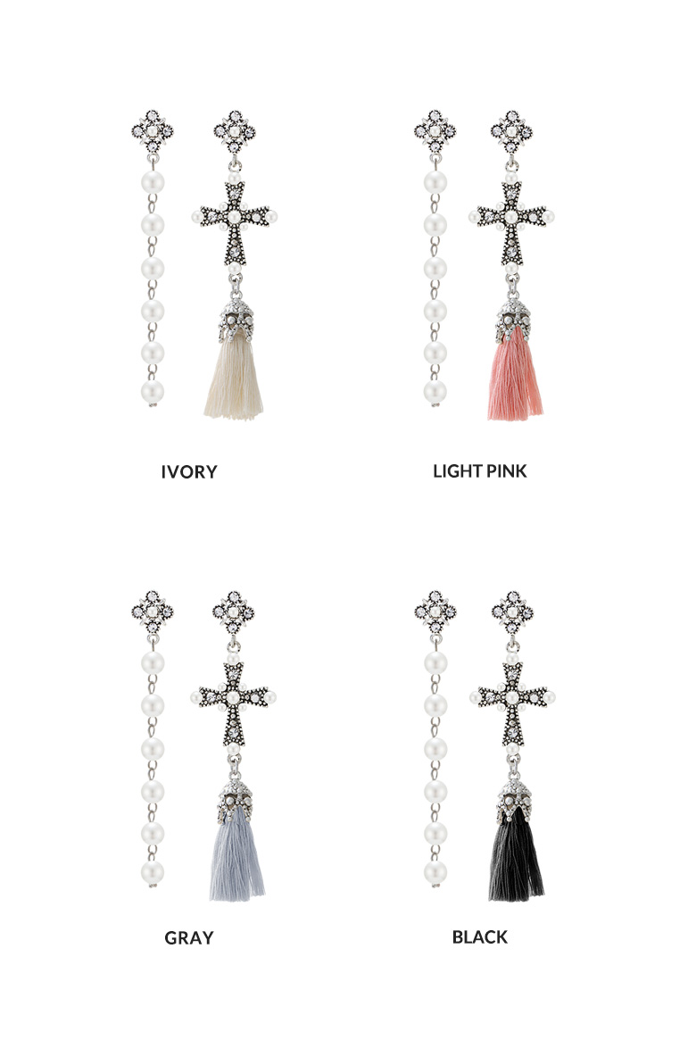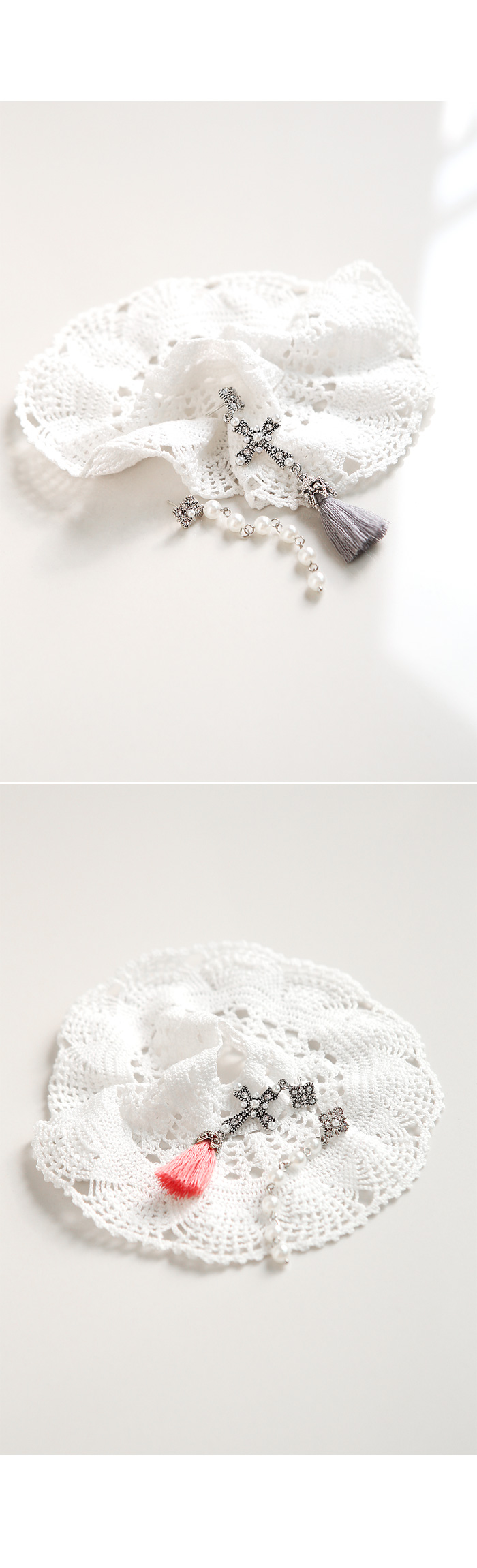에스닉한 빈티지 컬러의 톤다운된 베이스에 크로스 모티브와 태슬의 조화가 패셔너블한 제품입니다.좌우 언발란스한 제품으로 한쪽은 태슬을 한쪽은 진주로 구성되었는데요,진주 특유의 페미닌한 느낌과 태슬의 구성이 유니크한 아이템이예요.