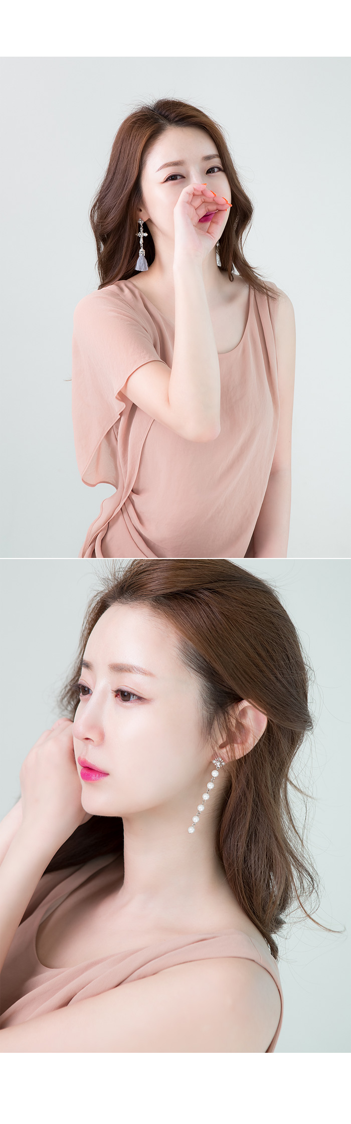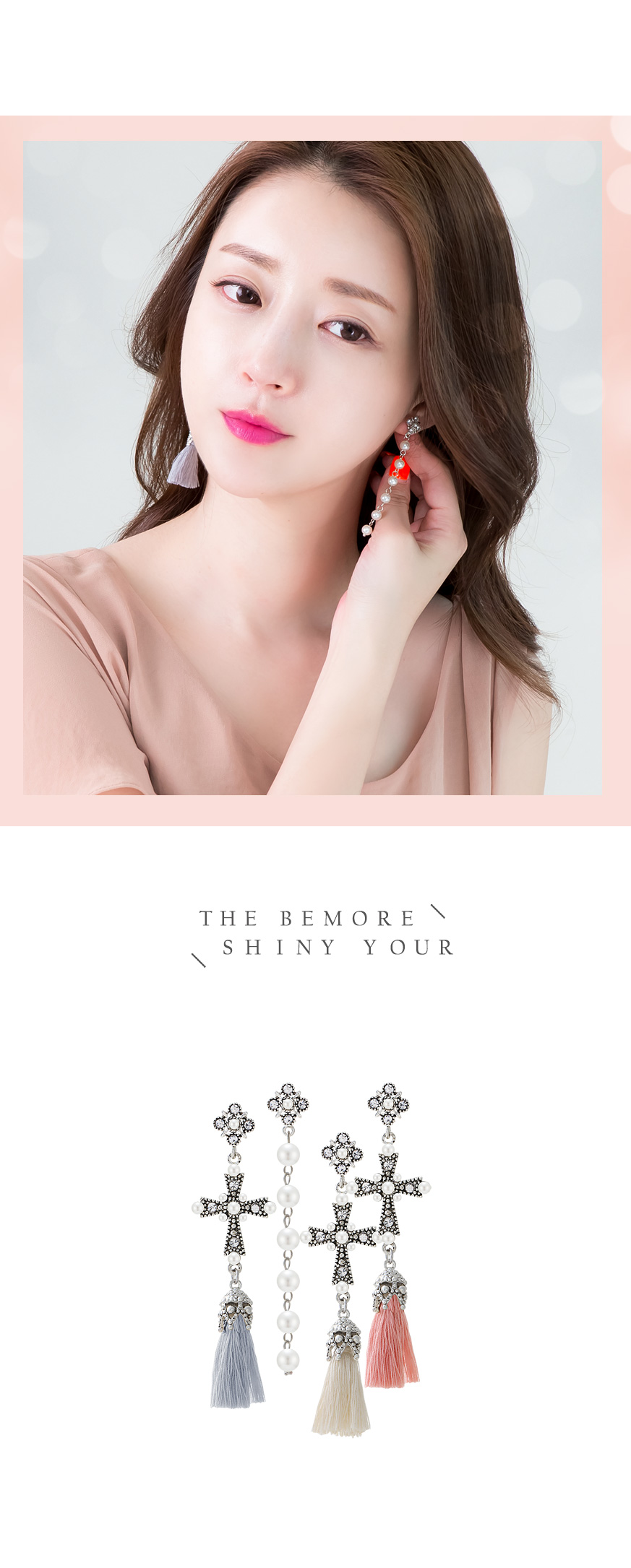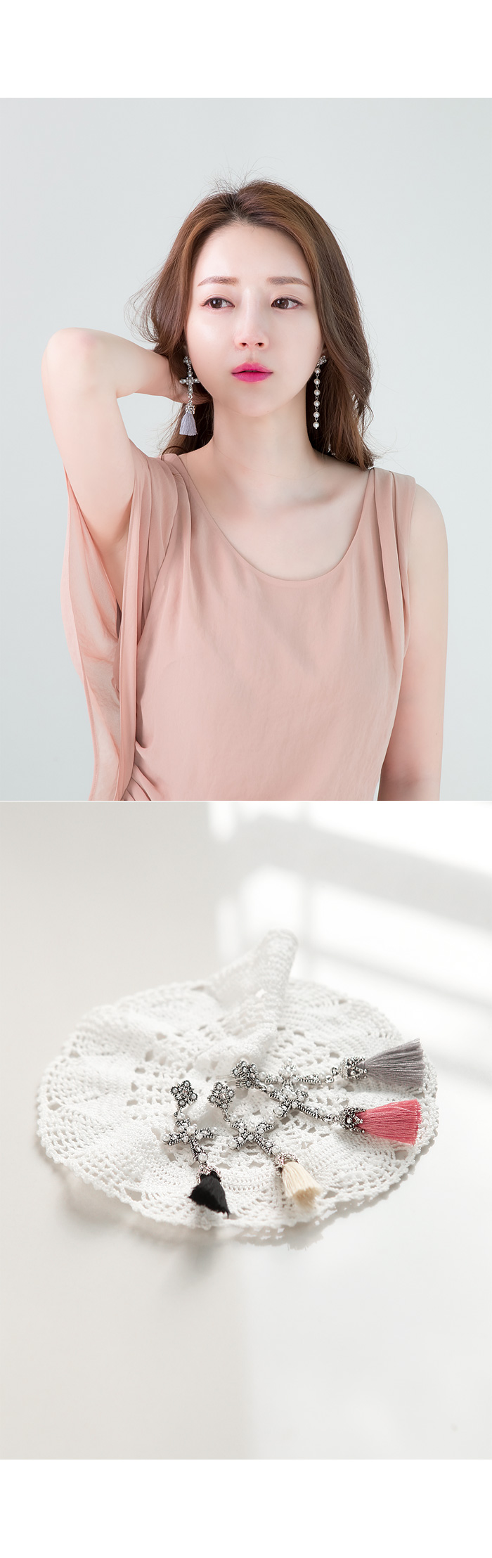 에스닉한 빈티지 컬러의 톤다운된 베이스에 크로스 모티브와 태슬의 조화가 패셔너블한 제품입니다.좌우 언발란스한 제품으로 한쪽은 태슬을 한쪽은 진주로 구성되었는데요,진주 특유의 페미닌한 느낌과 태슬의 구성이 유니크한 아이템이예요.