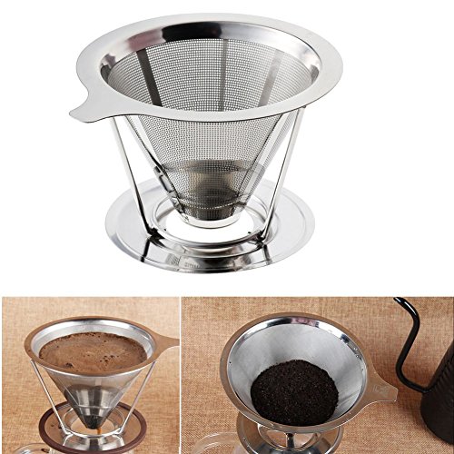 TOP QUALITY MATERIALS - our fine mesh dual stainless coffee filter is made of the highest quality stainless steel without using paper filters; its reinforced steel mesh is extra durable, allowing brewing at the perfect rate; the bottom base will stay on and not break; with the extra fine wire mesh at the lower part of the filter; no grounds end up in your cup;
