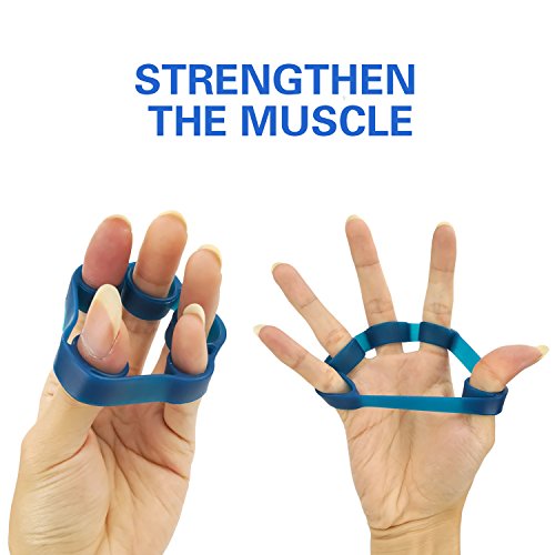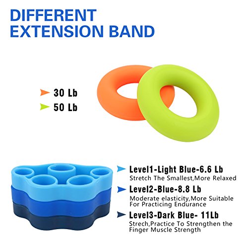 3 Piece Finger Resistance Bands Three force level: Level1-light blue-6.6 Lb, Level2-Blue-8.8 Lb, Level3-dark blue- 11Lb. Use different bands based on force requirement Material: Silica gel Exercise Strength: Pull and Brace NOTE: The finger resistors are a little small at the first exercise, which will hold your finger tightly
