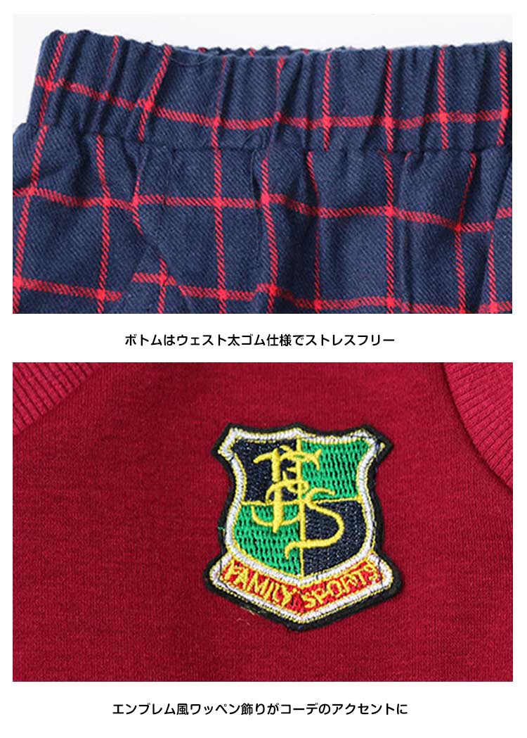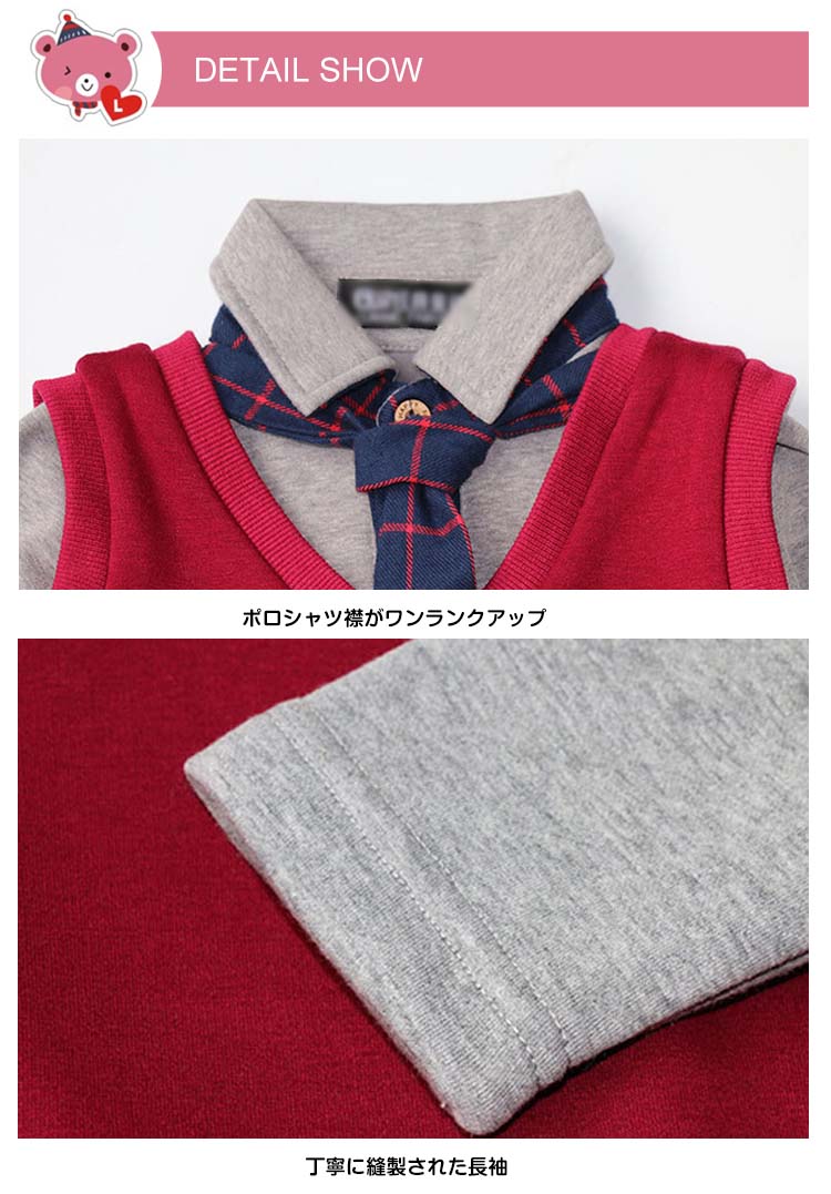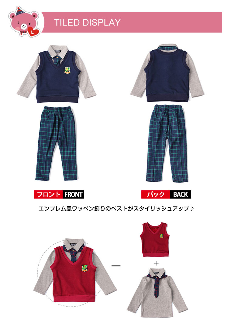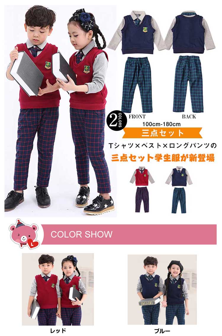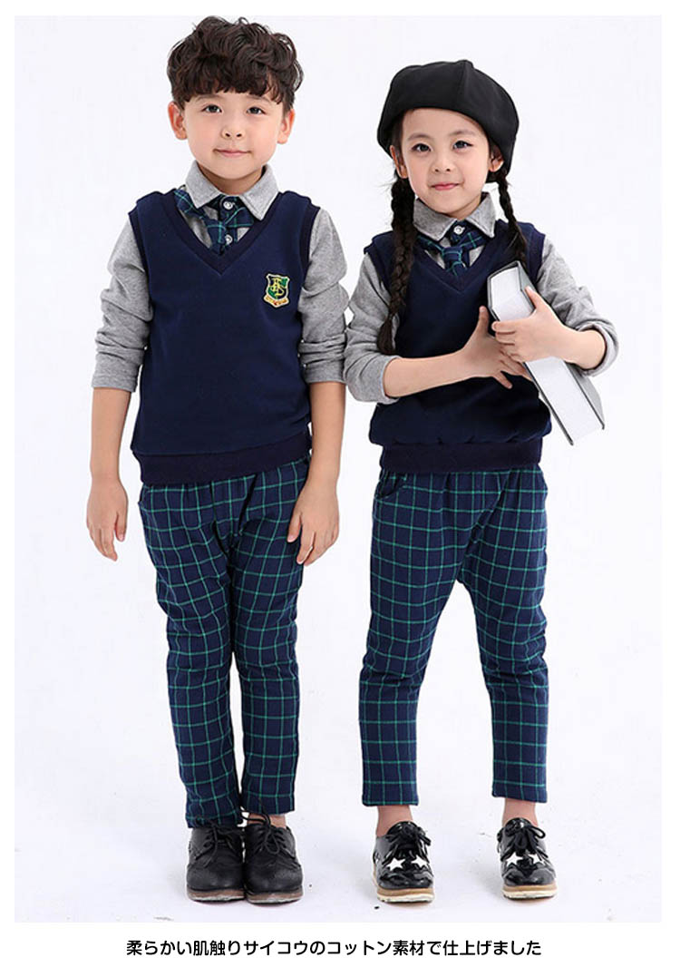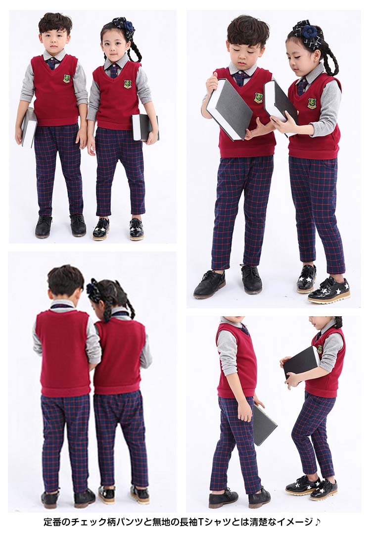 | Tシャツ×ベスト×ロングパンツの三点セット学生服が新登場柔らかい肌触りサイコウのコットン素材で仕上げました定番のチェック柄パンツと無地の長袖Tシャツとは清楚なイメージ♪エンブレム風ワッペン飾りのベストがスタイリッシュアップ♪ | |