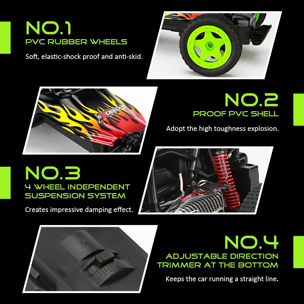 By using front and rear suspension, 4.8V 700mAH lithium battery, rc motor, powerful, powerful, high grip powerful "V" type tread wide tire creates amazing driving power.