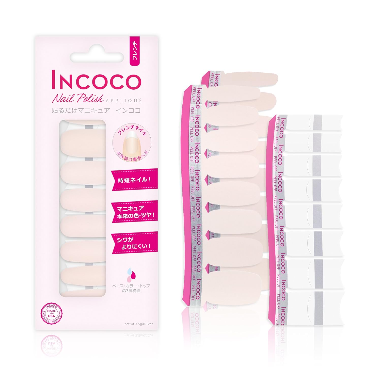 アメリカ生まれの貼るだけマニキュア 「インココ・ネイル・ポリッシュ・アップリケ」(Incoco)はマニキュア成分でできたシートタイプのマニキュアです。乾かす時間不要、塗りムラ知らず、且つマニキュアならではの発色やツヤを楽しめます。インココでまったく新しいマニキュア体験をしてみませんか!白のティップにパールピンクのカバーをかぶせて完成させるフレンチネイル。 ベーシックなデザインの中にもパールの輝きがあり、ちょっと華やかなネイルにしたいときにオススメ