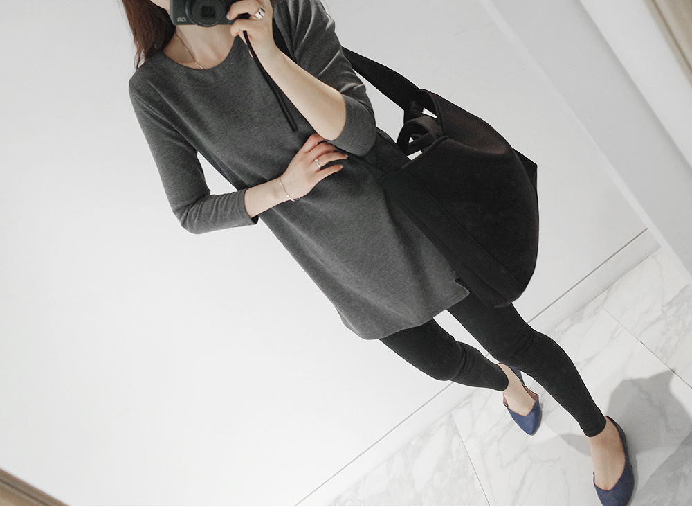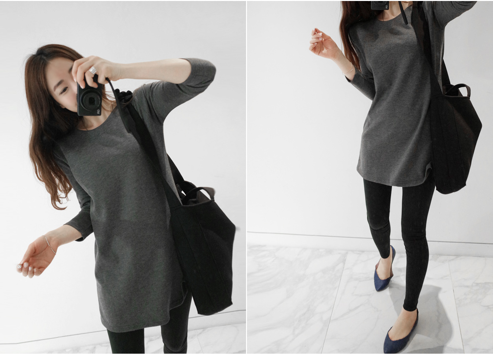기본 라운드 네크라인 두줄 박음선으로 깔끔한 라인을 살려주었구요 소매는 7부소매로 나왔어요~
