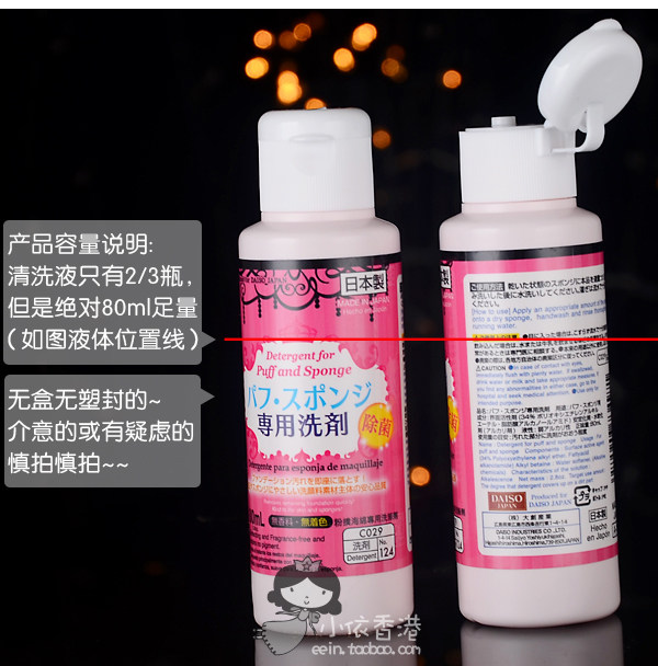 注意事项:这罐洗涤剂不是罐满的,大概瓶子的四分之一是空的。是因为他的质地的问题,本身如果摇晃或者震动会产生泡沫。所以瓶子必须留有空间,大创故意把瓶子放大,液体流动空间就多了。80ml的量是足的,介意的慎拍!不用担心一罐80ML会太少,平时一星期清洗一次,一瓶大概可以用半年了!