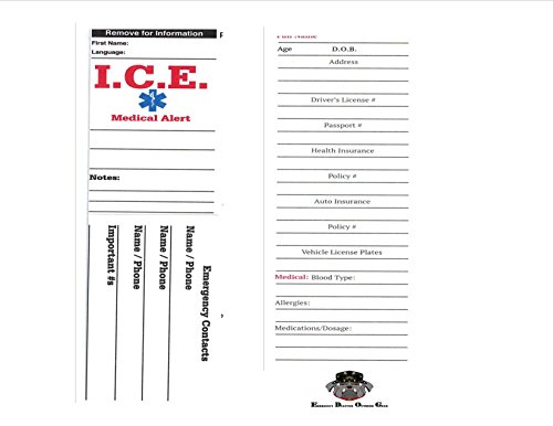 -. Feature : One (1) READI USA I.C.E. (In Case of Emegency) Travel & Every Day Carry Medical Alert & Information Card / Business Card Sized - 2" x 7" - Folded Tent Business Card designed by a First Responder / Medical Alert - Special Conditions, Allergies, Blood Type, Medications / Emergency Contacts & Information - Emegency Contact List, Health & Auto insurance Information, Drivers License & Passport Information, Plus room for custom notes and information. / Designed to be carried everyday by all, especially Seniors, Children, and medically impaired whom might become lost or disoriented. If you are out and about, running, cycling, hiking or anywhere away from home, be prepared with a Readi USA I.C.E. Card
