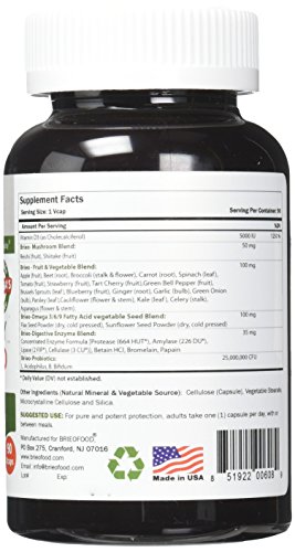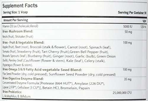 ReleaseDate : 2017-10-11 Studio : Best Nutritionals LLC Publisher : Best Nutritionals LLC Binding : Health and Beauty Product Description Vitamin D3 (as Cholecalciferol), Brio- Mushroom Blend: Reishi (fruit), Shiitake (fruit), Brio- Fruit Vegetable Blend: Apple (fruit), Beet (root), Broccoli (stalk flower), Carrot (root), Spinach (leaf), Tomato (fruit), Strawberry (fruit), Tart Cherry (fruit), Green Bell Pepper (fruit), Brussels Sprouts (leaf), Blueberry (fruit), Ginger (root), Garlic (bulb), Green Onion (bulb), Parsley (leaf), Cauliflower (flower stem), Kale (leaf), Celery (stalk), Asparagus (flower stem). Brio-Omega 3/6/9 Fatty Acid vegetable Seed Blend: Flax Seed Powder (dry, cold pressed), Sunflower Seed Powder (dry, cold pressed) Brio-Digestive Enzyme Blend: Concentrated Enzyme Formula [Protease (664 HUT), Amylase (226 DU), Lipase (2 FIP), Cellulose (3 CU)], Betain HCl, Bromelain, Papain Brieo-Probiotics: L. Acidophilus, B. Bifidum 0