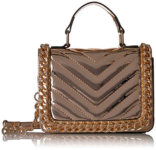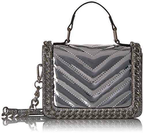 Mini chevron quilted crossbody bag with metal top handle and pom pom detail.